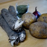 500 gr. Klettenwurzeln | ca. 500 gr. mehlige Kartoffeln | 1 Zwiebel |1 Eßl. Butter | 1 Eßl. Dinkelmehl | Brühe vom Kochen der Klettenwurzeln | Milch | Salz, Muskat, Pfeffer | 1-2 Eßl. Brennnesselsamen | 1 TL Brennnesselpulver