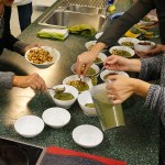 Als Vorspeise gab es Distelsuppe mit Topinambur und gerösteten Kartoffelsticks. Die Hauptspeise bestand aus Spitzkohlsalat mit Knoblauchsrauke, Wiesensauerampfer und Cashew-Mayonaise, wildem Salat (u. a. aus Bachbunge und Bitterem Schaumkraut) mit Orangenfilets und wilder Möhre, Nachtkerzengemüse mit Quitten, Quinoa mit gerösteteten Springkrautsamen und Distelwurzel-Gemüse mit Esskastanien und Pastinakengrün. Für das Dessert haben wir eine fruchtige Kornelkirschencreme mit Vanillesauce, salzig glasierten Bucheckern und Mädesüß-Rosinen  zubereitet und dazu knusprige Blätterteigtäschchen mit Mispelmus, gewürzt mit Nelkenwurz, gebacken.