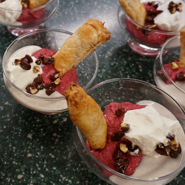 Kornelkirschen-Creme mit Mispel-Blätterteig