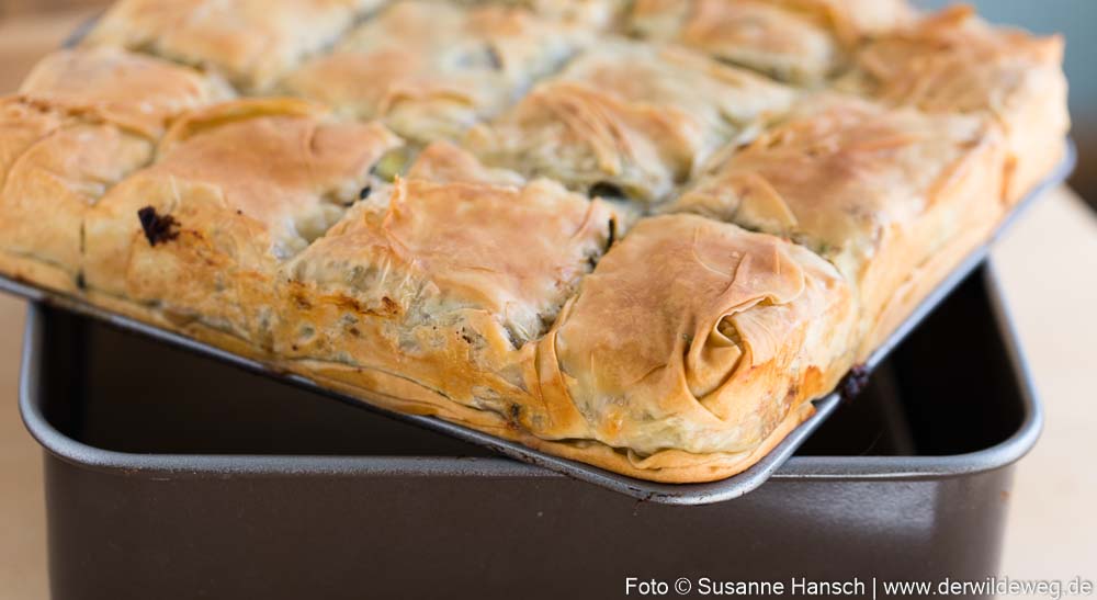 In der Fastenzeit wird die Pastete in Griechenland übrigens vegan gemacht. Dazu werden Ei und Schafskäse einfach weggelassen.