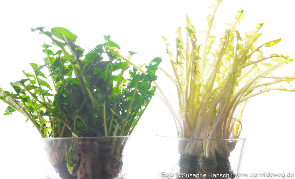 Aus den geernteten Wurzeln lässt sich den ganzen Winter über frisches Grün treiben. Man muss die Wurzeln nur in Wasser oder feuchten Sand stellen und warten – die grünen Blättchen treiben zuverlässig aus. Möchte man keine bitteren dunkelgrünen Blätter kann man ein Gefäß über die Wurzel stülpen oder sie im Dunklen treiben lassen. dann werden die Blättchen zart gelb, wie wir es vom Chicoree kennen, und schmecken milder. Mehr gesunde Inhaltsstoffe aber haben die dunkleren Blätter.