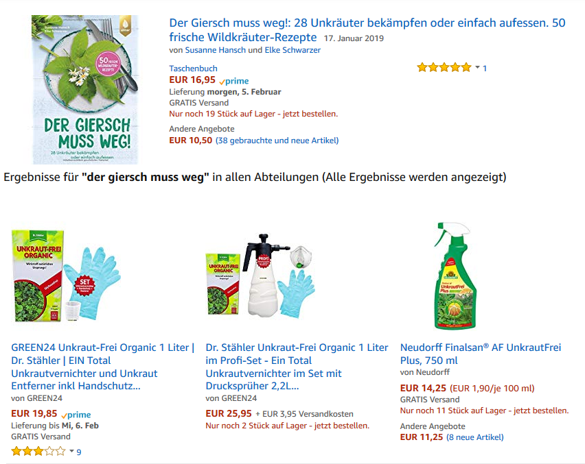 Sucht man auf amazon.de nach meinem Unkräuter-Kochbuch mit dem schönen Titel „Der Giersch muss weg“, dann bekommt man völlig unterschiedliche Suchergebnisse. Neben meinem Kochbuch werden auch Unkrautvernichtungs-Mittel (mit Handschutz!!) angezeigt. Das ist nur ein Spiegel unsere Welt.