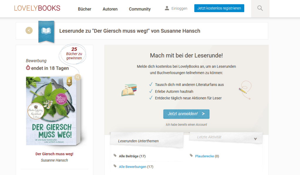 Der Ulmer Verlag verlost auf lovelybooks.de 25 Rezensions-Exemplare meines Bestsellers der Giersch muss weg.