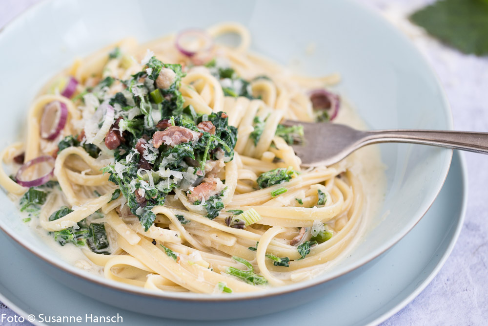 Pfanne erhitzen, Speck würfeln und auslassen. Frühlingszwiebel fein schneiden und mit anschwitzen lassen. Mit der Sahne aufgießen, einköcheln lassen, salzen und pfeffern.