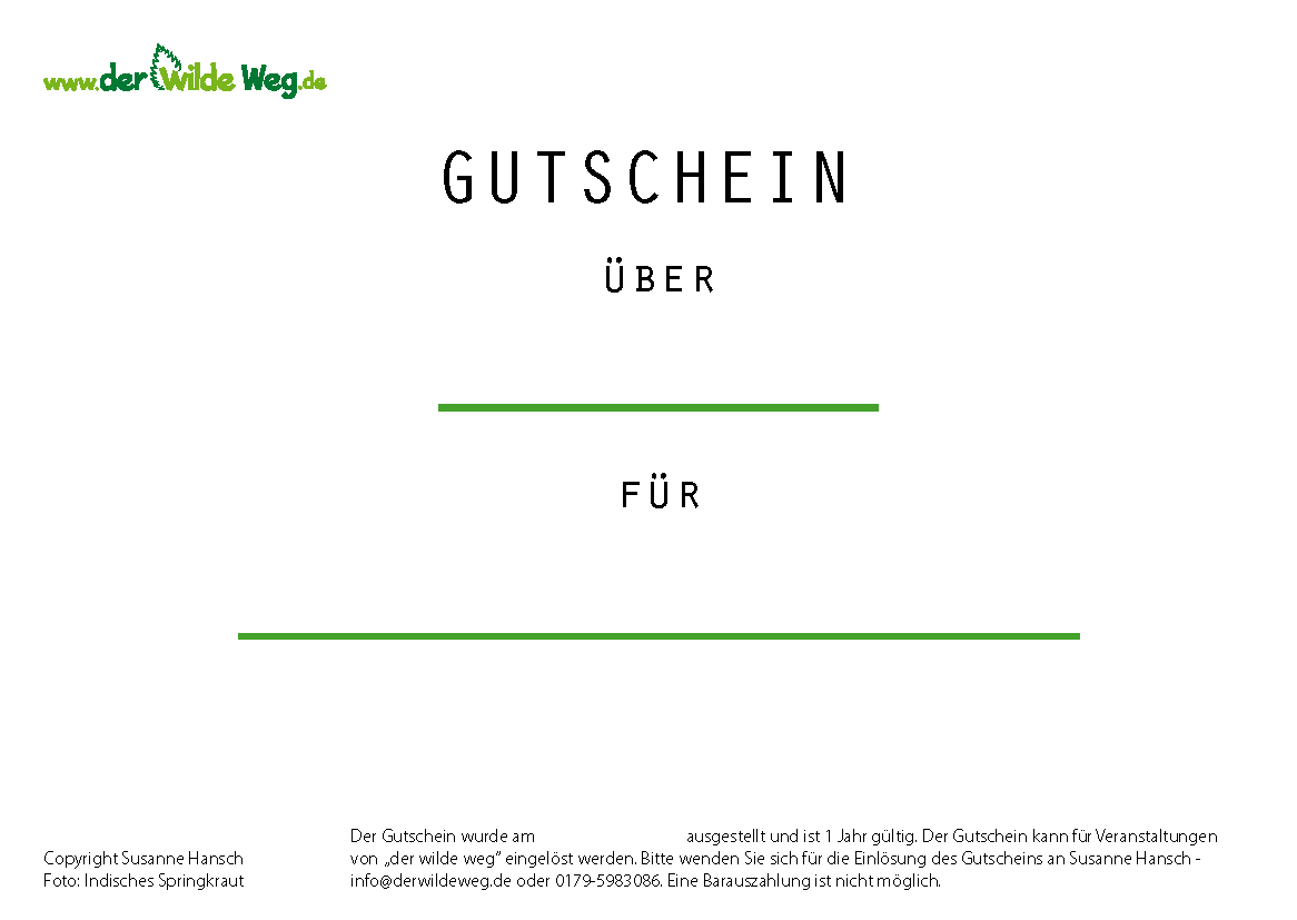 Schreibt eine Mail an info@derwildeweg.de mit dem Gutscheinbetrag, dem Namen der bzw. des Beschenkten und der Adresse für den Versand. Ich sende Euch dann die Kontoverbindung für die Überweisung zu. Für Gutscheinkarte und den Versand kommen zum Gutscheinbetrag 2,50 € dazu. Auf geht’s.