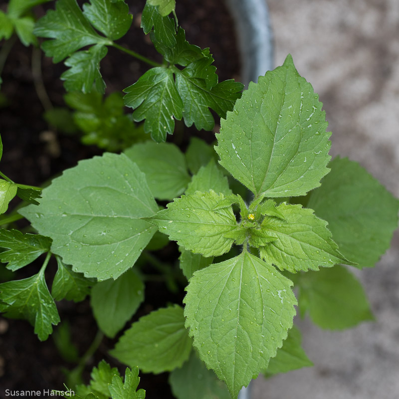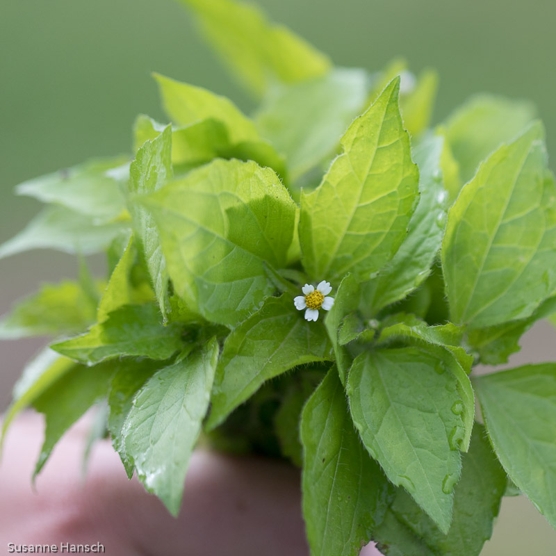 Das Franzosenkraut kommt aus Südamerika und zählt zu den Neophyten, d. h. zu den Pflanzen, die nach Kolumbus unseren europäischen Kontinent besiedelt haben. Zwei Arten gibt es bei uns: das kleinblütige und das stärker behaarte Behaarte Knopfkraut. Wo es sich mal angesiedelt hat, wird man es nicht mehr los. Mehrere Generationen im Jahr sorgen dafür. Gott sei Dank! Denn es ist ein schmackhafte Gemüsepflanze mit einem ganz typischen Geschmack, der mich an Sonnenblumenkerne erinnert. Geerntet wird es, solange die Blütenköpfchen noch kurz sind, denn dann sind die Blätter zart und die Blattmasse am größten.