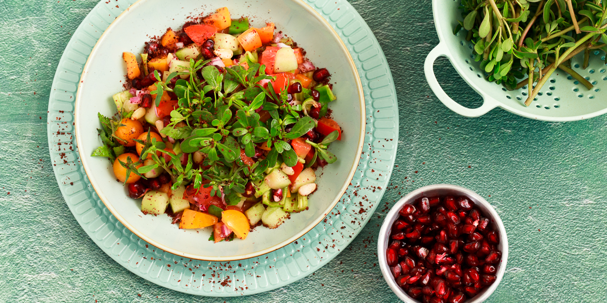 - Den Granatapfel entkernen. Die Tomaten und Gurken würfeln, Paprika entkernen und auch in Würfel schneiden. Zwiebel fein schneiden und Kräuter hacken. Alles vermengen und in eine große Schüssel geben. Portulak in mundgerechte Stücke zupfen und darauf anrichten.