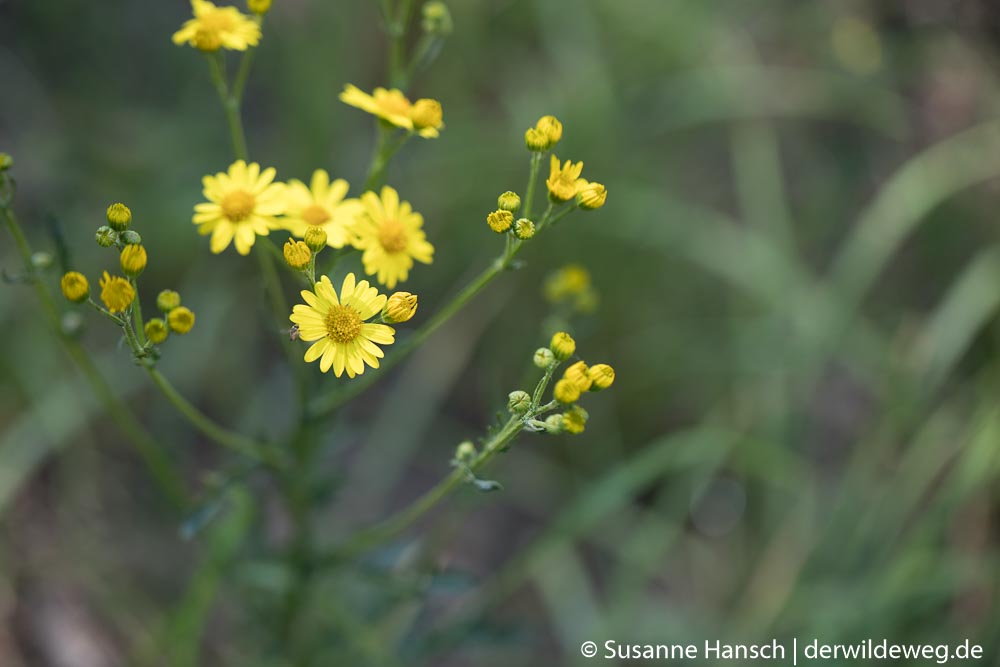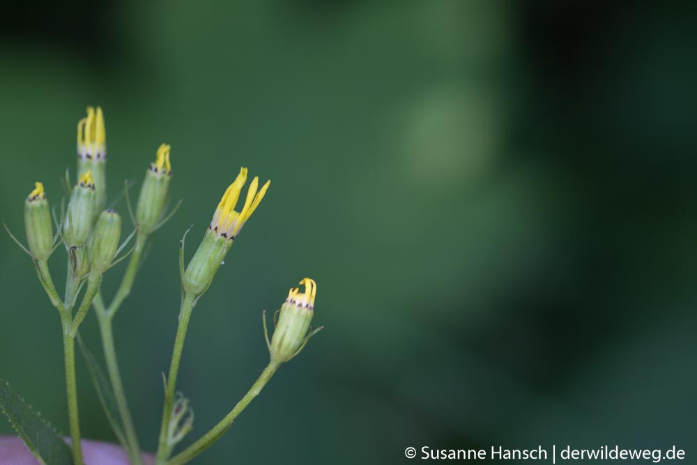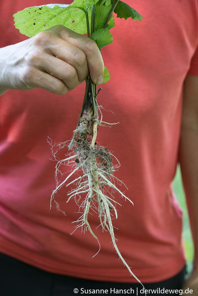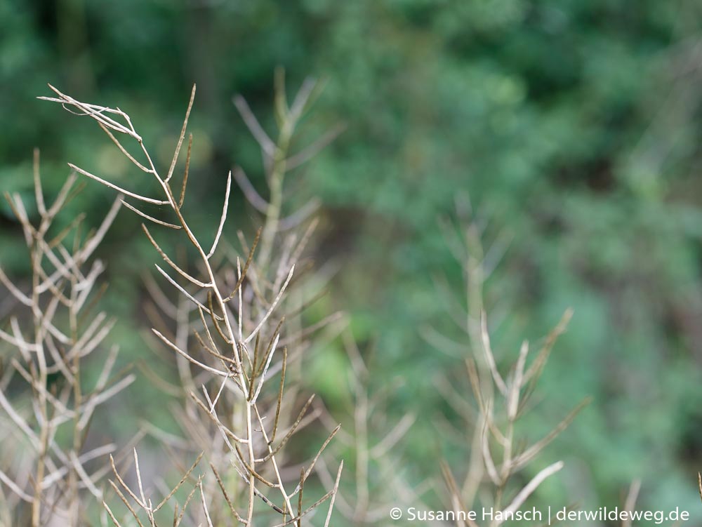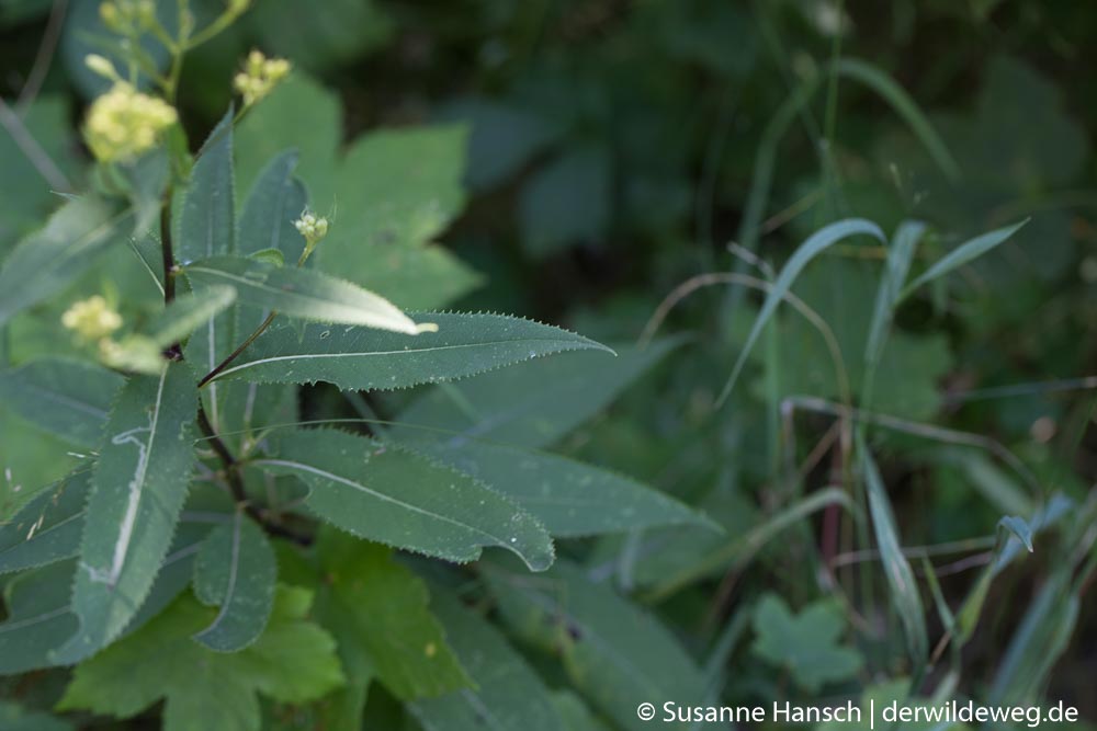 Unser Weg begann an den Ufern eines kleinen Sees, wo uns Wolfstrapp und Pastinake eine ganze Zeit beschäftigt haben. Auf der ersten große Wiese mit dicken Blütenknospen des Wiesenbärenklaus, dem gifigen Jakobs-Greiskraut, Fetter Henne und Knoblauchsrauke – Samen und kräftige Wurzeln – haben wir uns auch eine ganze Weile aufgehalten. Unser Ziel war die große Mädesüßwiese jenseits des Baches. Vorbei an leider schon verblühtem Geisbart und blühendem Rainkohl haben wir dann unser Ziel erreicht. Leider war das Mädesüß schon ziemlich verblüht und zum Teil von Mehltau befallen. So wurde es nichts mit der Ernte, aber auf dem weiteren Weg wurden wir schnell entschädigt. Reife Brennnesselsamen, eine schöne Engelwurz, Aufrechter Sauerklee und Wiesenkerbel waren die nächsten Wildpflanzen, die wir uns genauer angeschaut und manches davon auch probier, haben.