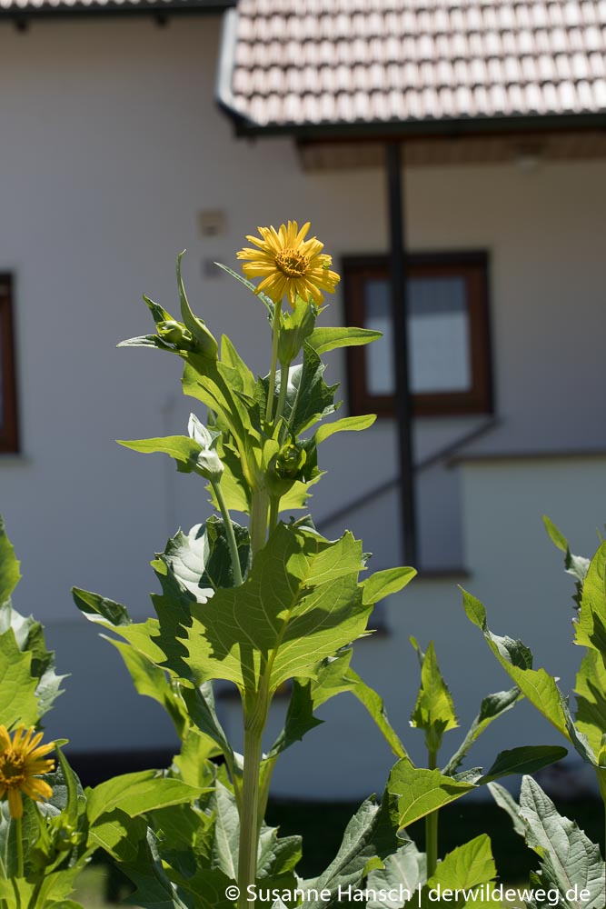 Hochgewachsenen Pflanzen mit leuchtenden gelben Blüten, die über einen Garrtenzaun schauten, haben uns dann noch bewegt – trotz der Hitze – noch einmal die Straßenseite zu wechseln. Wie wir von den Gartenbesitzern erfahren haben, handelte es sich um „Durchwachsene Silphien“, Korbblütler aus Nordamerika, die schnell zum blühenden Sichtschutz hochwachsen und auch als Energiepflanzen verwendet werden können. Wikipedia weiß da Einiges zu berichten.