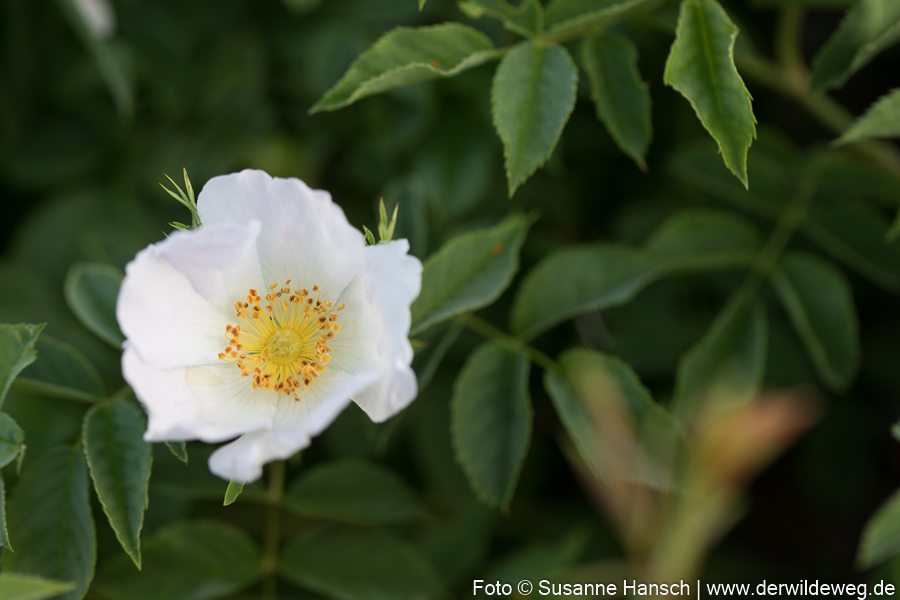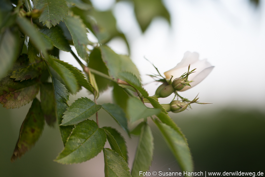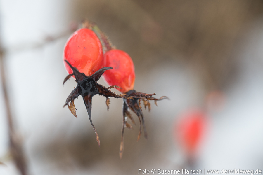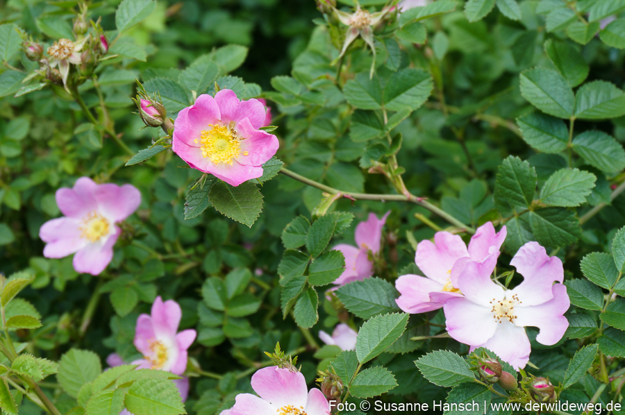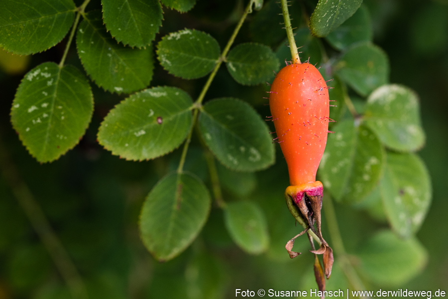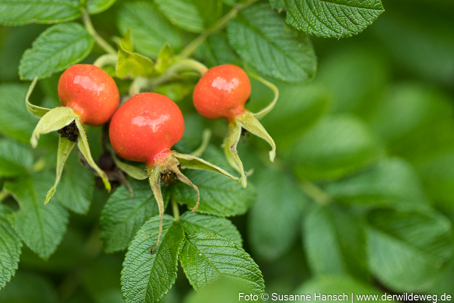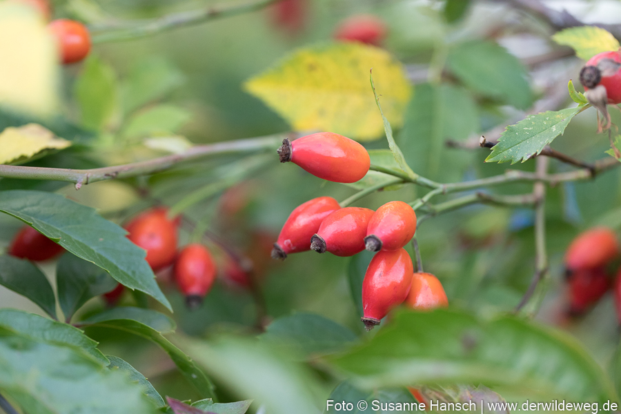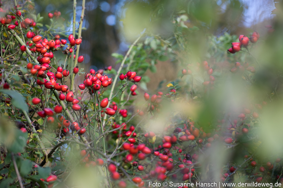 Nun leuchten sie uns überall entgegen, die roten Früchte der Hundsrose (Rosa canina), die Hagebutten. Botanisch korrekt müsste man sagen der „Sammelnussfrüchte“ der Hundsrose. Denn die eigentlichen Früchte sind die Nüsschen im Inneren des fleischigen roten Blütenbodens, den wir als Frucht wahrnehmen. Der Rosenstrauch fühlt sich am Waldrand und in der Sonne wohl, gehört in jede Wildstrauch-Hecke, siedelt sich auf Brachen an und wird inzwischen auch wieder in den Gärten angepflanzt. Die Hundsrose ist ein wichtiges Schutzholz für die Vögel, denn die Dornen der überhängenden Zweige schützen ihre Nester. Im Mai gehören die Hundsrosen zu den ersten Rosen die blühen. Ihre flachen, tellerförmigen ungefüllten Blüten bieten vielen Insekten Nahrung, anders als die gefüllten Rosenblüten der Zuchtrosen, deren manchmal zu hunderten dicht stehenden Blütenblätter den Insekten den Zugang zu Pollen und Nektar versperren.