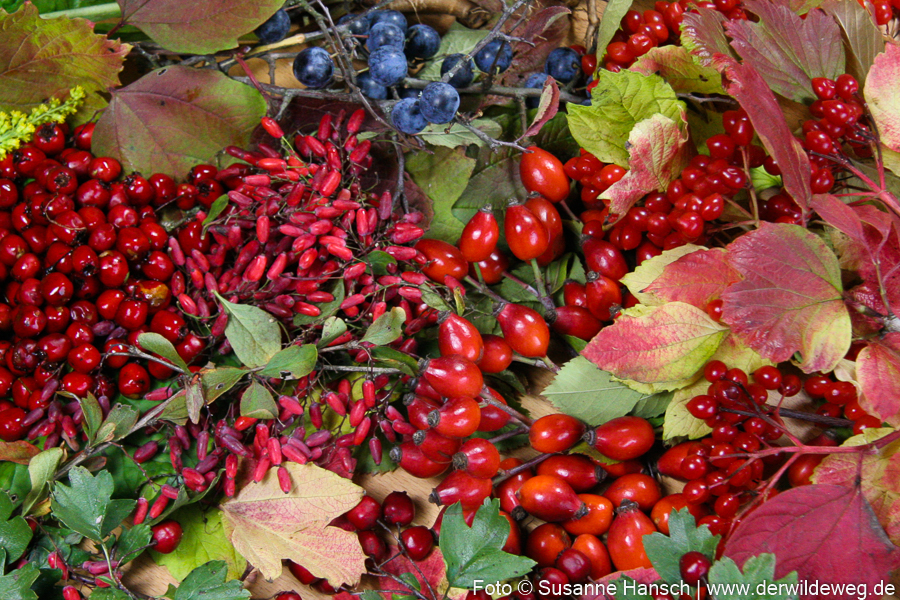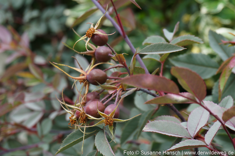 Doch der Hagebuttenstrauch ist nicht nur ein Schutzgehölz, sondern auch ein Nährgehölz. Mit dem Herbst färben sich seine ovalen Früchte langsam rot und röter und laden zur Ernte ein. Mit den ersten Frösten werden die Früchte weich. Zupft man sich eine der reifen weichen Hagebutten ab, kann man das süße aromatische Fruchtmark durch die entstandene Öffnung herausdrücken und gleich vor Ort genießen.