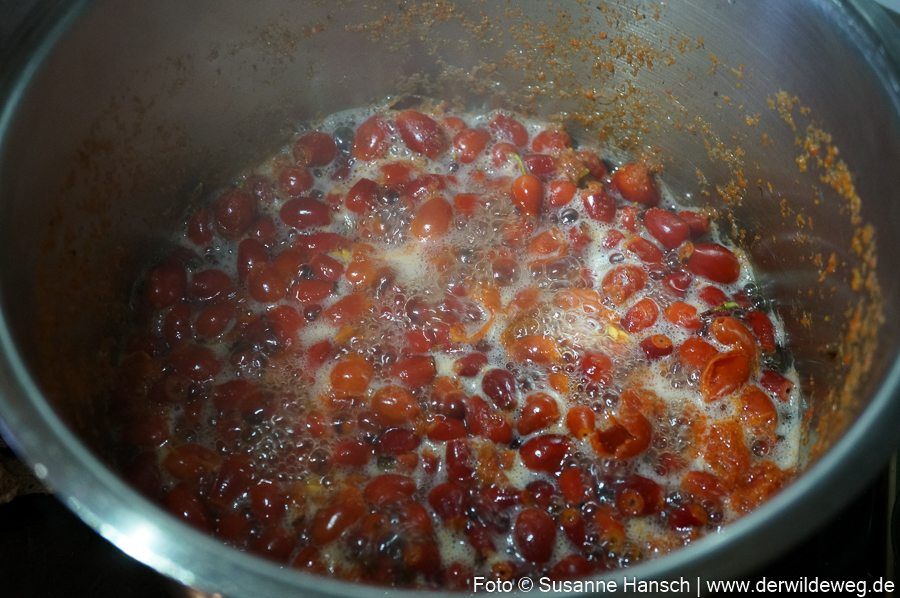 Doch auch würzige Zubereitungen sind köstlich, denn das Hagebuttenmark kann wie Tomatenmark oder passierte Tomaten verwendet werden. Man kann es gut gewürzt als Nudelsauce genießen, auf die Pizza streichen, Suppen daraus kochen oder es für deftige Chutneys verwenden. Im Vergleich zu Tomatenmark ist das Hagebuttenmark fruchtiger, was vielen Gerichten gut steht. Es spricht aber auch nichts dagegen Tomaten und Hagebutten zu mischen.
