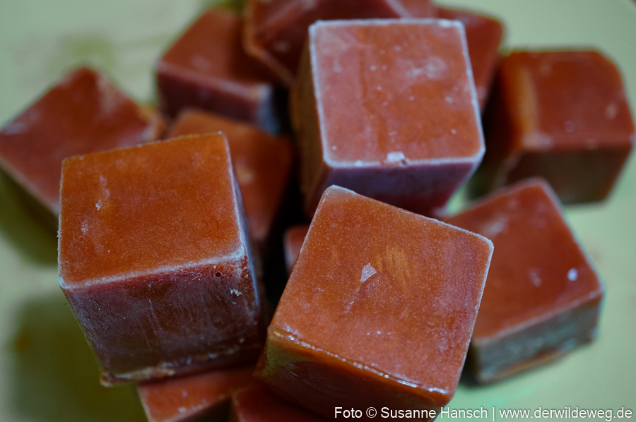 Eine schnellere Methode ist die Verwendung Fruchtpress-Vorsatzes, den es für manche Küchenmaschinen, z. B. den Jupiter-Küchenblock gibt. Der Vorsatz wird an dern Fleischwolf-Vorsatz geschraubt. Die Transportschnecken schieben die Fruchtmasse durch die fein gelochte Fruchtpresse. Eigentlich hatte ich bei meinem ersten Versuch mit der Fruchtpresse vor, diese Masse anschließend noch im Hochleistungsmixer zu pürieren, aber sie war auch so haarfrei. Wer eine solche oder ähnliche Fruchtpresse hat sollte es unbedingt mal probieren, das ist wirklich die effektivste und müheloseste Methode. Übrigens lässt sich das Mark auch gut einfrieren. Ich verwende dafür Eiswürfelbehälter aus Silikon. Sind die Würfel gefroren gebe ich sie in einen Beutel und ich kann immer so viel Würfel entnehmen wie ich gerade brauche.