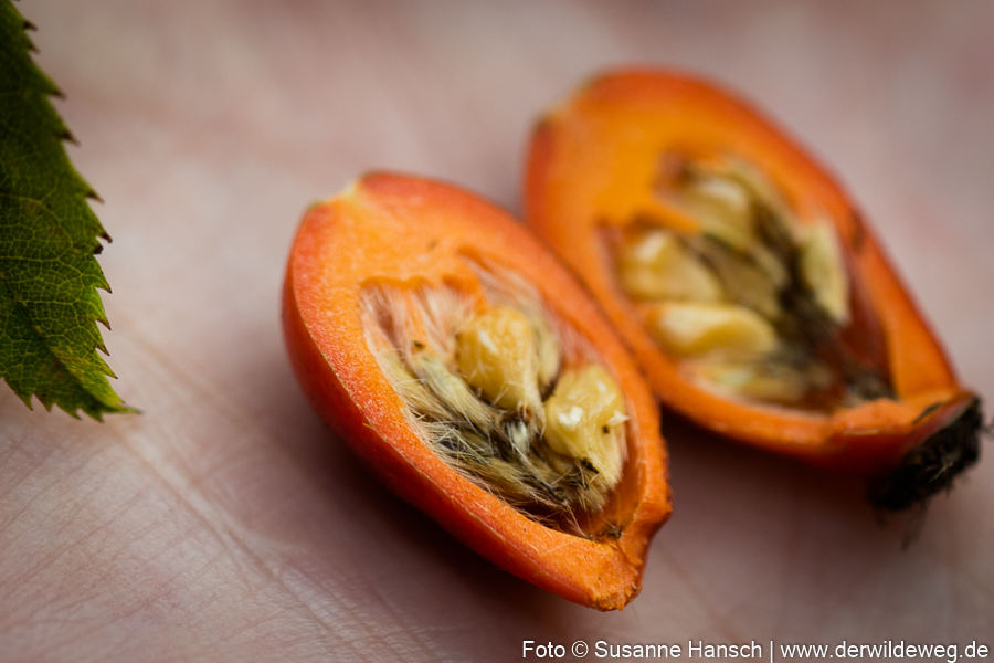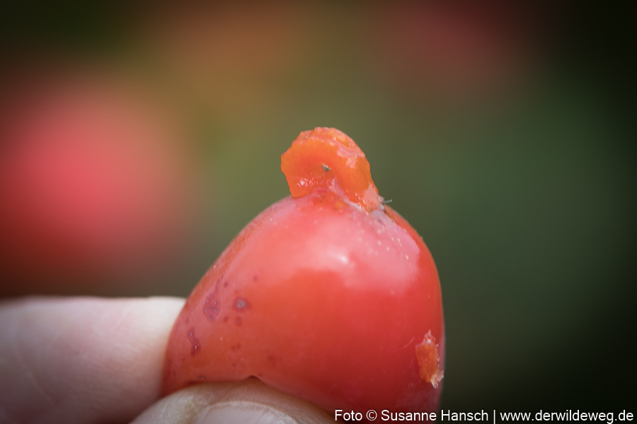 Das Fruchtmark zu gewinnen ist gar nicht so einfach, denn die Nüsschen im Inneren der roten Schale sind mit kleinen widerborstigen Härchen behaftet, die man vollständig aus dem vom Mark herausbekommen muss, da sie in Mund und Hals sehr unangenehm kratzen. Diese Härchen sind der Grund, warum zerdrückte Hagebutten sich so gut als „Juckpulver“ eignen. Ich kann mich noch gut an diese Erfahrung aus meiner Schulzeit erinnern, als ich mit anderen Mitschülerinnen Opfer von Hagebutten-Attacken wurde.