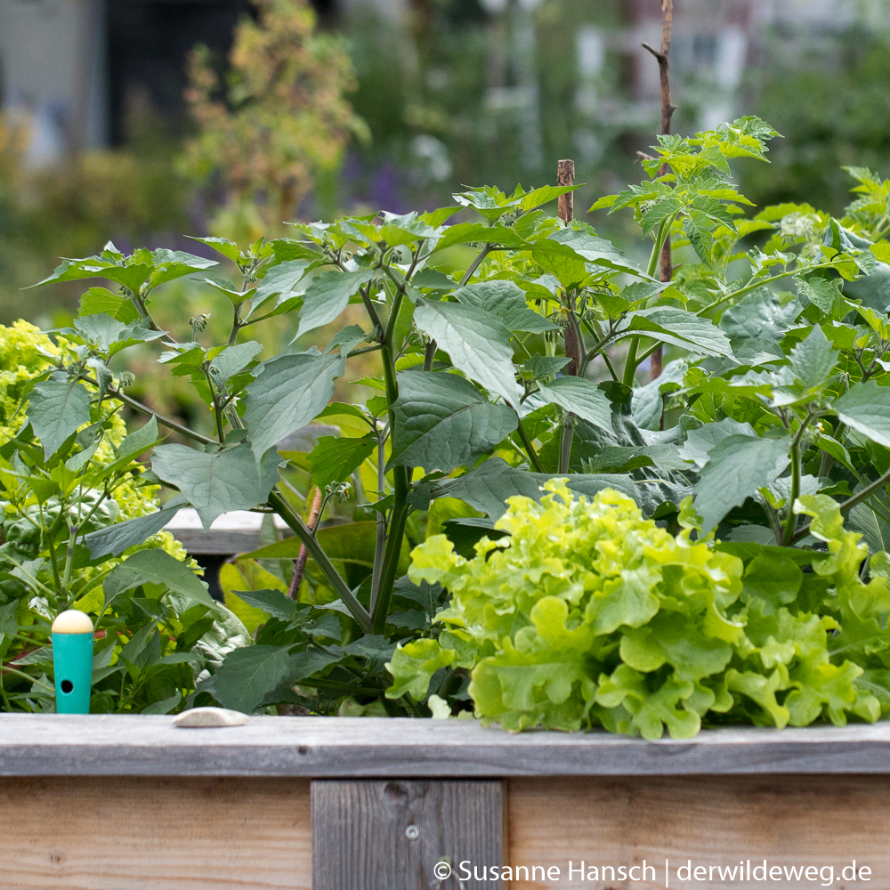 Der Schwarze Nachtschatten, eine wilde Verwandte von Tomate und Kartoffel, ist bei uns häufig. Er ist ein typisches Ackerbegleitkraut, dass aber auch den Garten und schon mal ein Hochbeet erobert. Seine Blüten sehen aus wie kleine Turbane und ähneln denen der verwandten Kartoffel. Nach der Blüte trägt er kleine runde Früchte in Büscheln, die wie Mini-Tomaten aussehen. Bei Reife färben sich die Beeren schwarz. Daher sein Name.