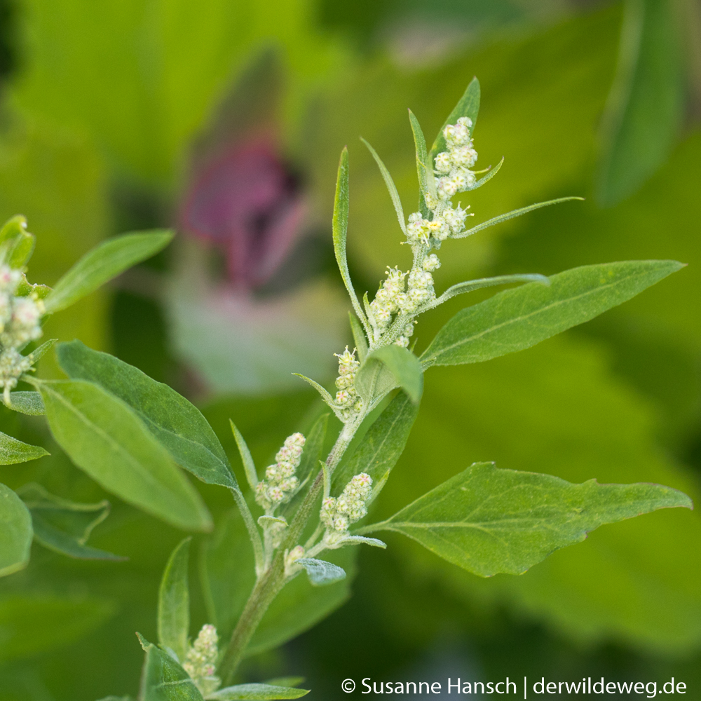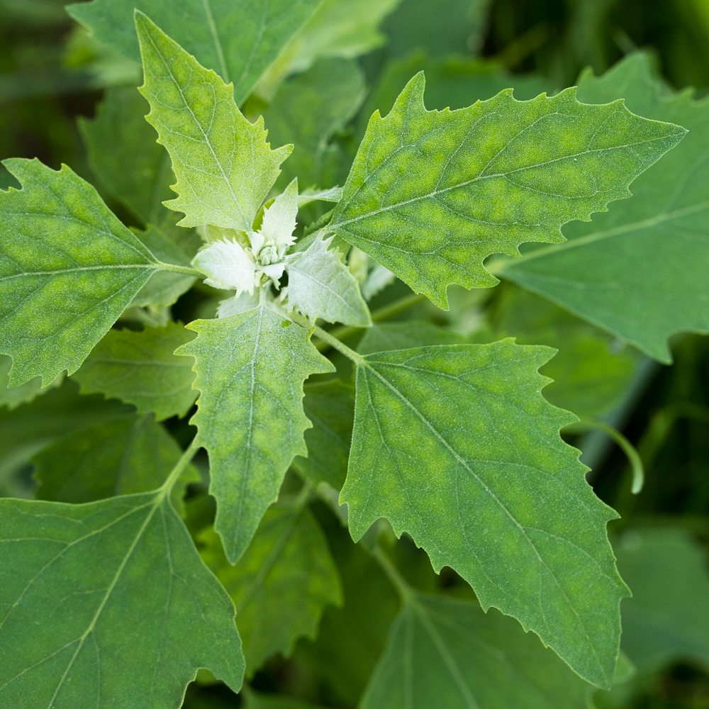 Weißer Gänsefuß: mehlartiger Belag an den jungen Blättern, eher rautenförmige Blätter, Blattrand gezähnt