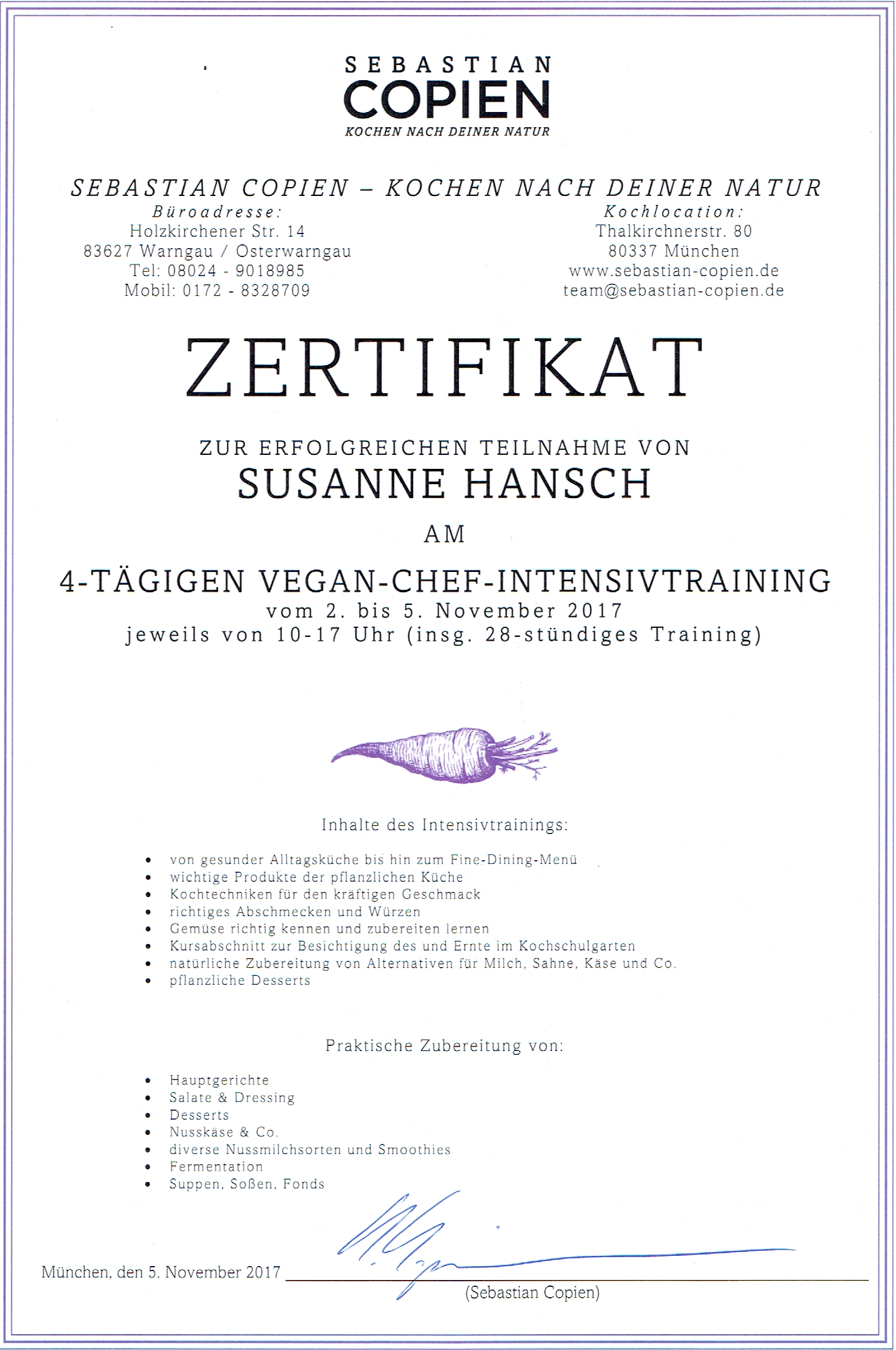 Ich bin klassische Flexitarierin. Seit 2016 habe ich mehrere vegane Kochkurse bei Sebastian Copien in München mitgemacht und bin begeistert von seiner excellenten veganen Kochkunst. Es schmeckt so unglaublich gut, dass man es kaum beschreiben kann und hat mit „asketischer Fleischersatzküche“ nicht das Geringste zu tun. Das hat Einfluß auf meine Ernährung und meine Küche zu Hause aber natürlich auch auf meine Kochkurse.